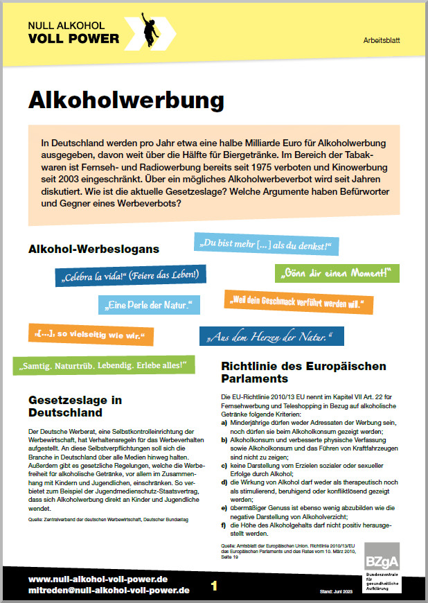 Das Arbeitsblatt „Alkoholwerbung“ gibt Beispiele für Alkohol-Werbeslogans und informiert über die aktuelle Gesetzeslage in Deutschland. Auf der zweiten Seite werden Meinungen von Werbegegnern und -befürwortern einander gegenübergestellt. Vier Arbeitsaufträge und zwei Linktipps regen zum Weiterdenken und Weiterklicken an.