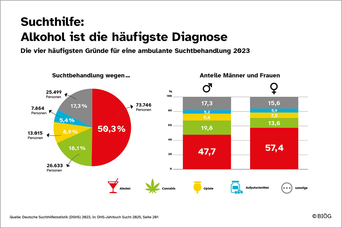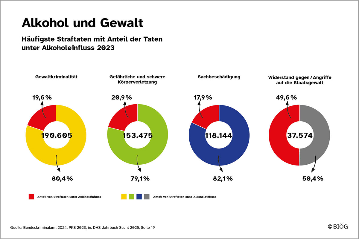 Vorab muss man festhalten: Die meisten Menschen, die Alkohol konsumieren, werden nicht kriminell. Straftaten, die im Zusammenhang mit Alkoholkonsum stehen, haben im Verlauf der letzten zwanzig Jahre sogar abgenommen. Bei schwerwiegenden Straftaten, zum Beispiel Gewaltdelikten, spielt Alkohol jedoch weiterhin eine relevante Rolle: Vor allem bei Widerstand gegen und tätlichen Angriffen auf die Staatsgewalt (Polizei, Vollzugsbeamte usw.) war im Jahr 2023 laut Polizeilicher Kriminalstatistik des Bundeskriminalamtes die Hälfte der Straftäter alkoholisiert. Unter Einfluss von Alkohol steigt das Gewaltrisiko also an.