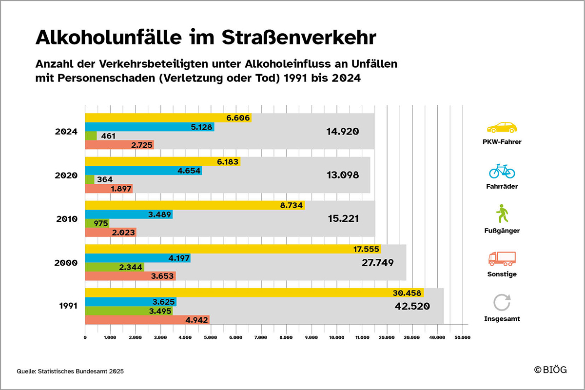 Die Zahl der Verkehrsunfälle unter Alkoholeinfluss hat in den vergangenen Jahrzehnten deutlich abgenommen. Im Jahr 1991 gab es noch 42.520 Unfälle mit alkoholisierten Verkehrsteilnehmenden. Im Jahr 2024 lag die Zahl bei 14.920 – also ungefähr einem Drittel. Das ist zwar eine gute Nachricht, aber die Zahlen sind trotzdem nicht zufriedenstellend: Durch Alkohol kommt es immer noch jedes Jahr zu mehreren tausend Unfällen mit Verletzen oder Toten. Die meisten Alkoholunfälle gibt es an Wochenenden und Feiertagen, wenn die Menschen häufiger unterwegs sind und feiern.
