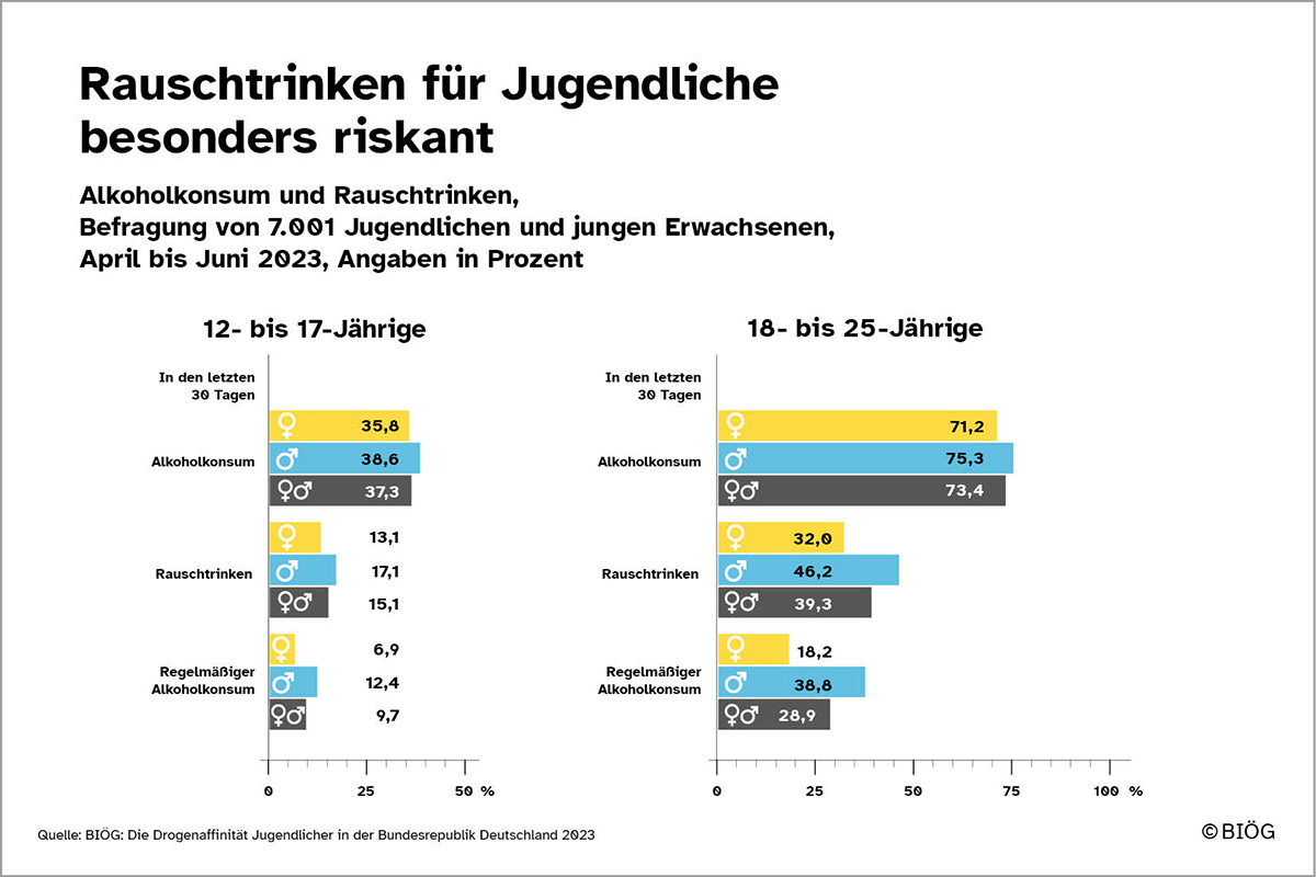 Bei einer Befragung des BIÖG im Jahr 2023 gab etwa jeder siebte Jugendliche (15,1 Prozent) an, in den letzten 30 Tagen mindestens einmal bis zum Alkoholrausch getrunken zu haben. Für männliche Jugendliche heißt das, mindestens fünf Gläser Alkohol hintereinander, für weibliche Jugendliche mindestens vier Gläser.