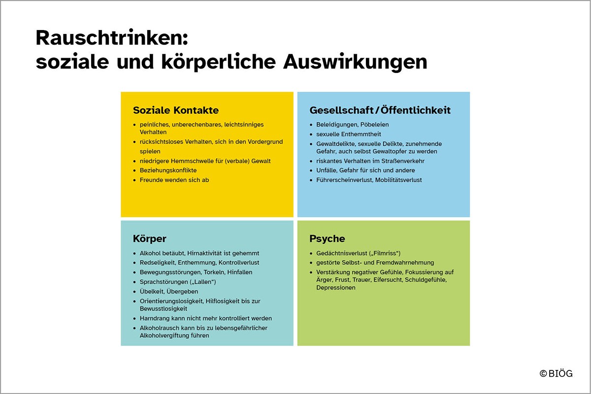 Das Schaubild verdeutlicht, welche unangenehmen Auswirkungen Rauschtrinken – also exzessives Trinken – nicht nur auf den eigenen Körper, sondern auch auf das soziale Umfeld haben kann.