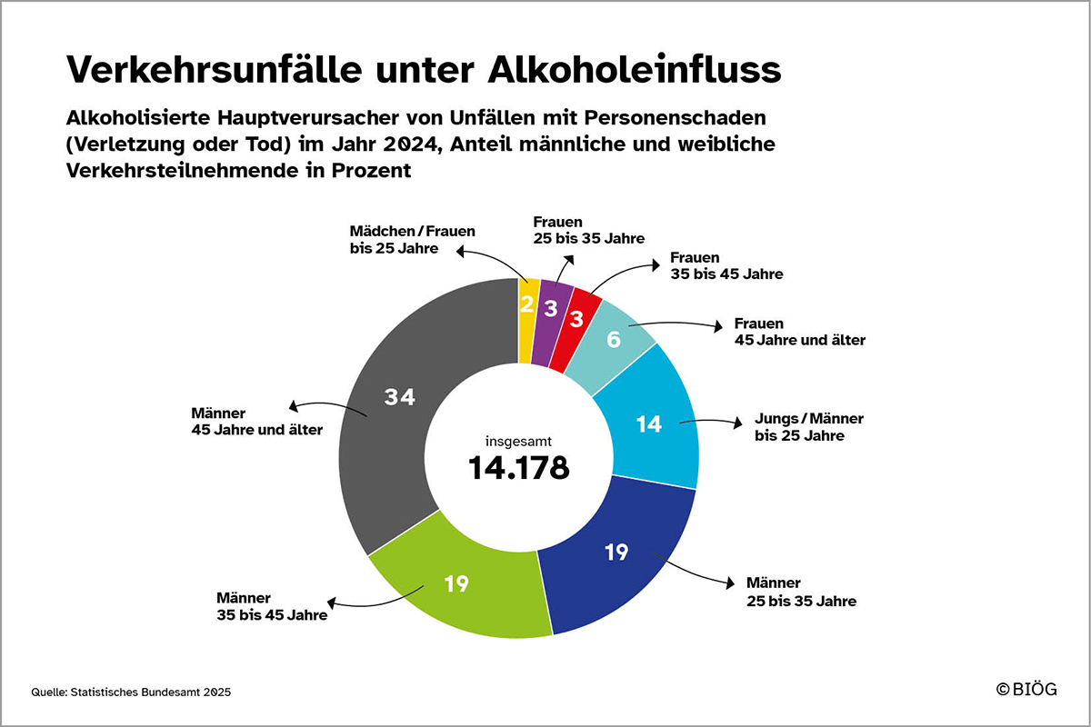 Durch alkoholisierte Verkehrsteilnehmende kommt es jedes Jahr zu mehreren tausend Unfällen mit Verletzen oder Toten. Zwischen Frauen und Männern bestehen dabei große Unterschiede: Nur 14 Prozent der alkoholisierten Unfallbeteiligten im Jahr 2024 waren Frauen, 86 Prozent Männer.
